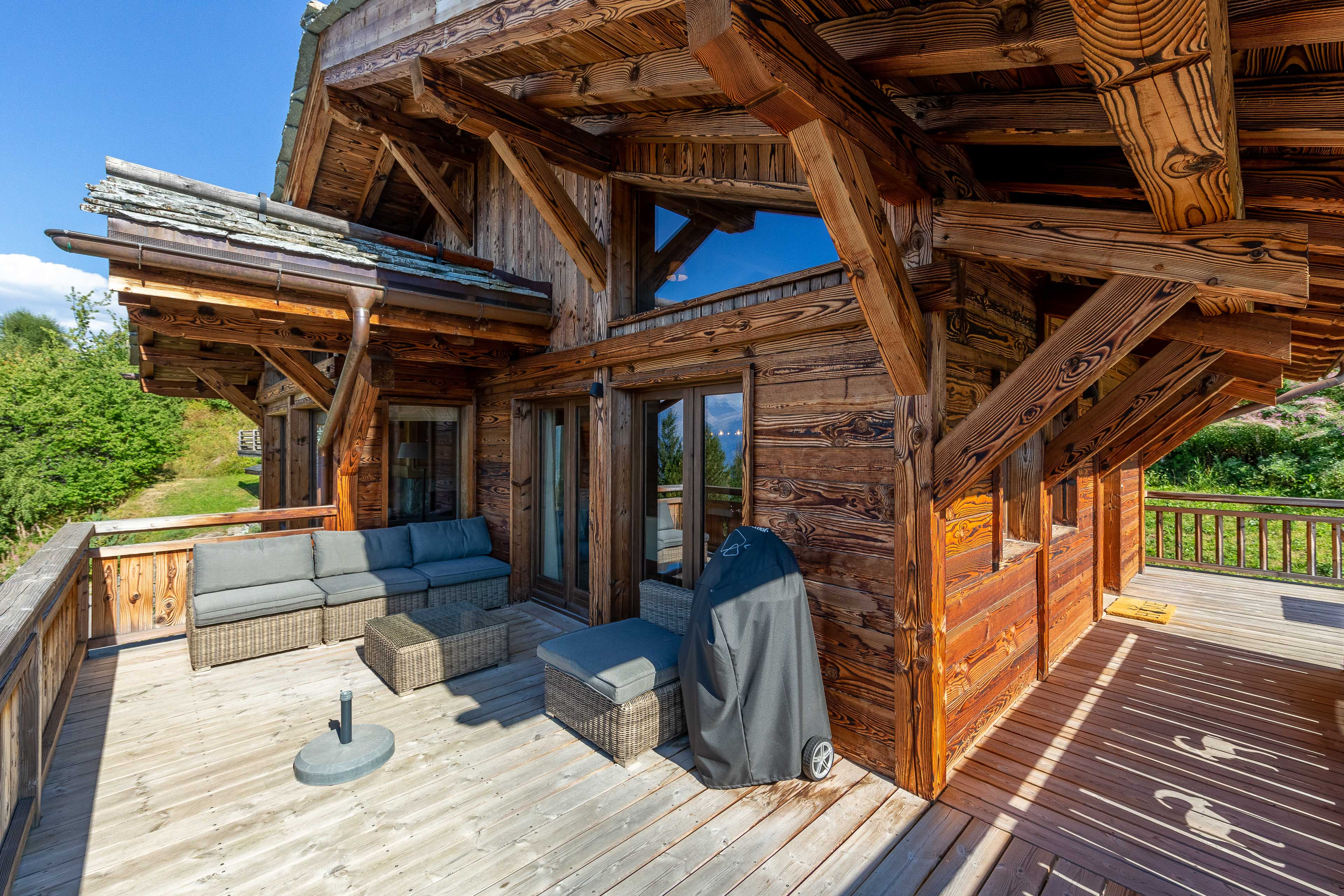 Endroit très ensoleillé avec 2 grandes terrasses, table et banc en lounge set + barbecue sur la 2ème terrasse.
